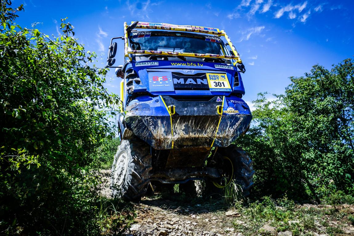 Bereits zum siebten Mal war das BFS Team beim traditionellen Pfingstlauf in Montalieu-Vercieu gestartet. Nachdem Marc Stegmaier und Jan Plieninger beim ersten Lauf in Belgien nur den fünften Platz erreicht hatten, konnte sich das Team am vergangenen Wochenende keine weiteren Patzer erlauben. Die Rahmenbedingungen für diesen Wettbewerb waren gut – selbst beim Dauerregen am Sonntag waren alle Sektionen befahrbar. Durch den Sieg beim zweiten Lauf ist das BFS Trucksport Team nun wieder auf Erfolgskurs und führt die Tabelle an. Allerdings kam es in Sektion 4 zu einem Stressmoment: Beim Überfahren eines Felsbrockens rutschte die Gelenkwelle aus der Verzahnung. Dadurch konnte das Team diese Sektion nicht wie geplant beenden und musste abbrechen. Fabian und Max (Mechaniker und Auszubildender bei Stegmaier) konnten den Schaden bis zur nächsten Sektion beheben und das Team fuhr ohne Punktverlust weiter.